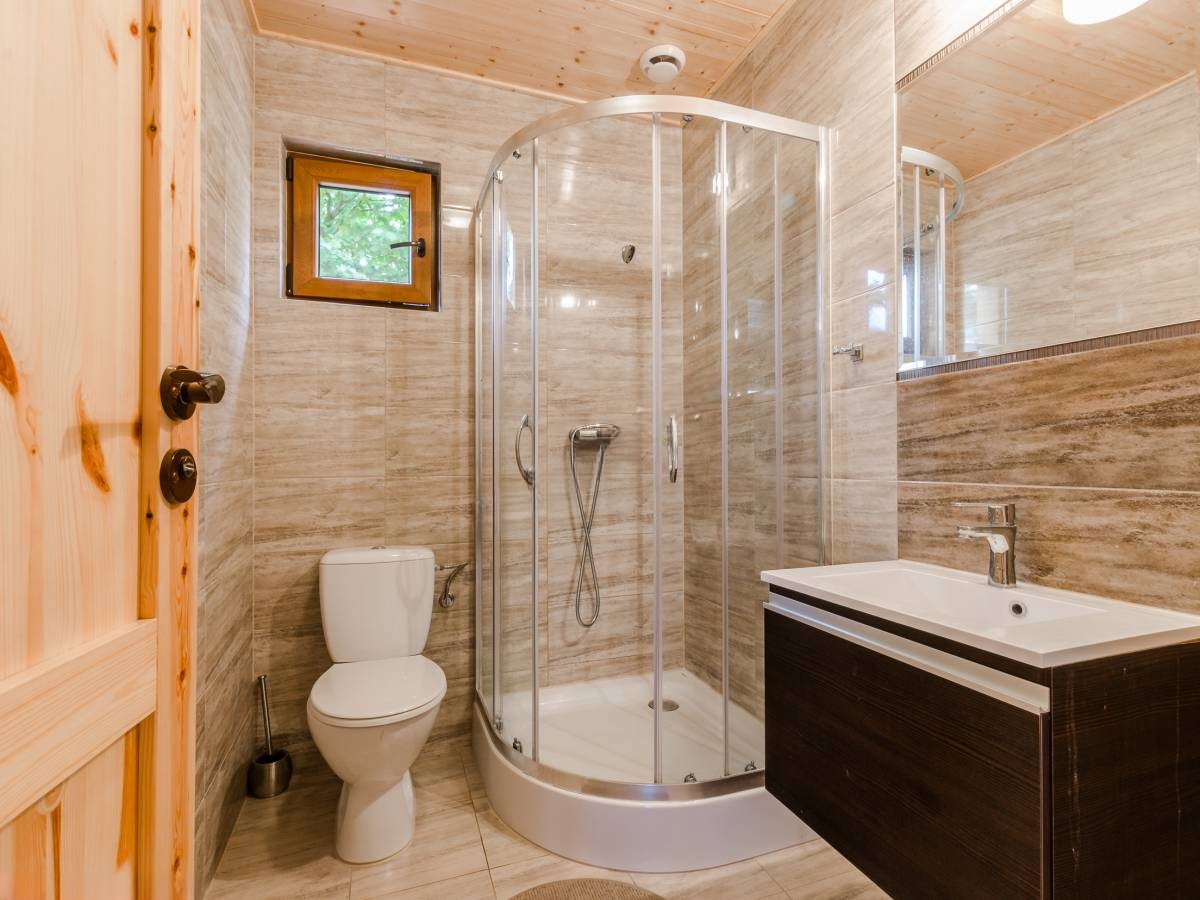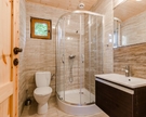 Łazienki wyposażone w kabinę prysznicową, wc, umywalkę z szafką, lustro.